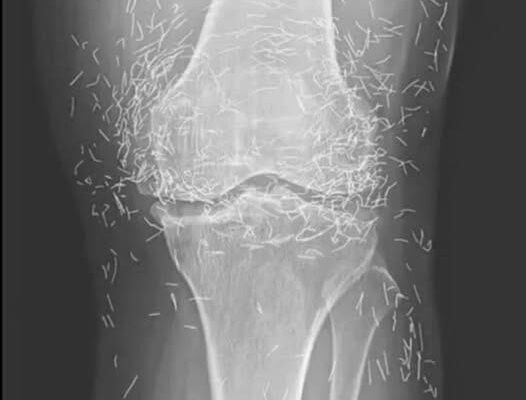 Years later, when doctors took X-rays to evaluate her knee condition, they weren’t prepared for what appeared on the images. Her knees were filled with dozens of bright, metallic flecks — tiny needles embedded deep within the joint area.