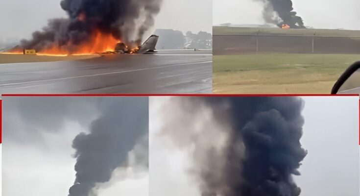Aerial view of an airport crash site with large flames and thick black smoke.