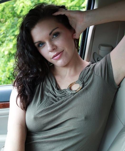 This may contain: a woman with long dark hair wearing a grey top and black shorts is posing for the camera