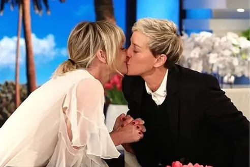 A man hugs two dogs on a bed, creating a confusing perspective.