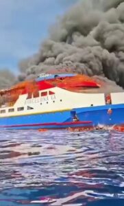 Eyewitness footage shared on social media showed the vessel partially engulfed in flames, with rescue ships spraying water onto the burning hull as terrified passengers huddled together on deck.